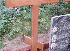 Мы восстанавливаем могилы исходя из любого исходного состояния. Так было и в этот раз. Мы изготовили и установили гранитный цоколь из красного гранита, клиент просил избегать черного цвета. Установили дубовые кресты и восстановили положение памятника, который был на могиле изначально. Посадили два можжевельника и оставили зону для будущих посадок цветов.
